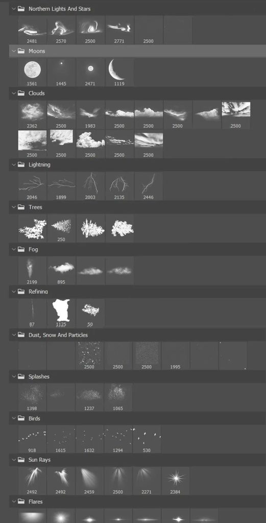 PS笔刷唯有1个.abr文件,但是包含了照明,粒子,北极光,月亮,闪电,雾,灰尘,耀斑,镜头光晕,飞溅,鸟类,树木,云层,光线等效果。