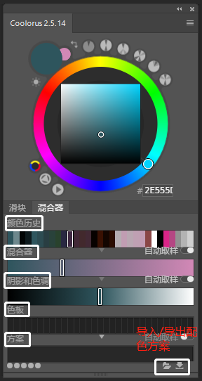 混合器的功能则更多。可调出颜色历史、前景和背景色混合器、阴影和色调、色板、配色方案等,还有导入导出配色方案的功能键如: