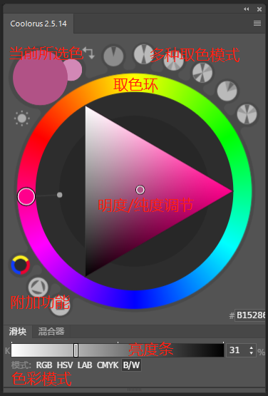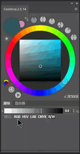 界面在最下方的滑块/混合器同样是具有切换功能。其中滑块支持在RGB/HSB/LAB/CMYK/BW几种色彩模式和亮度之间切换哦,功能同样类似于拾色器: